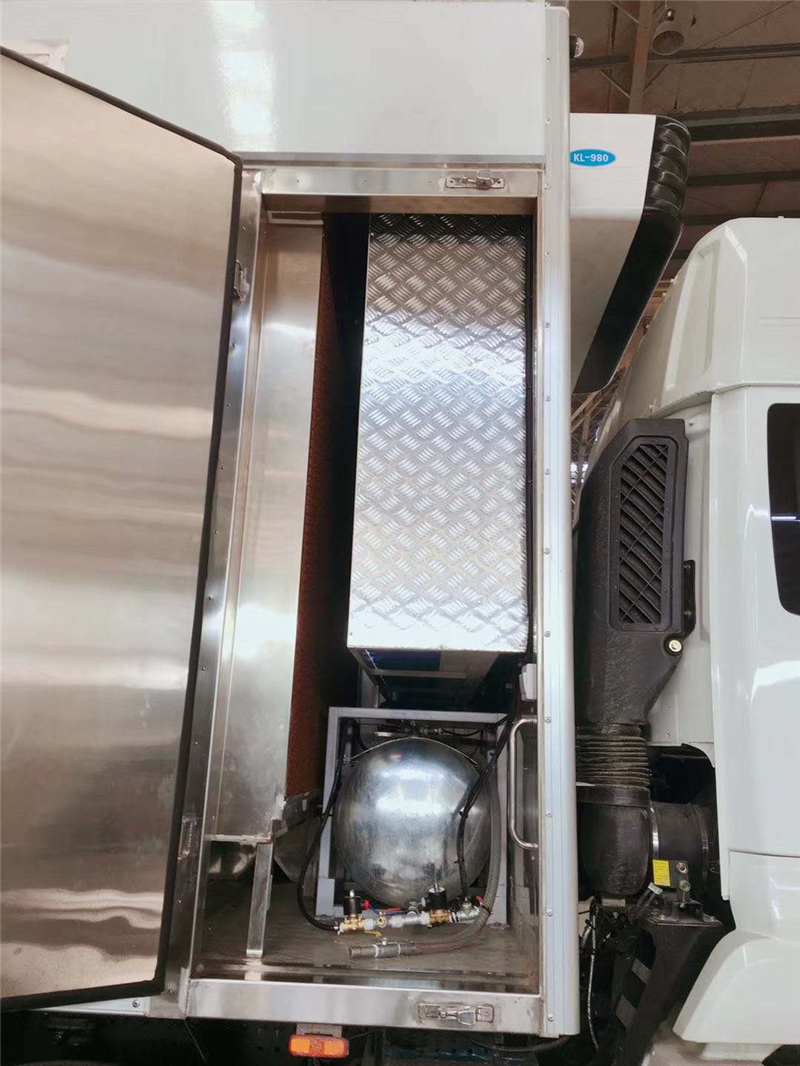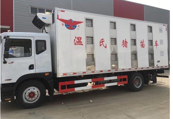 【豬苗車】上裝配置:外玻璃鋼,內(nèi)不銹鋼,兩層液壓升降層板,尾部液壓翻轉(zhuǎn)上豬平臺,層板為不銹鋼骨架鋪鋁花紋板。外部電動升降窗,排氣扇,柴油發(fā)電機,暖風加熱,喂水系統(tǒng),凈水箱、污水箱,箱內(nèi)攝像頭監(jiān)控,倒車影像,凱利制冷機組。(油暖加熱為選裝部件)