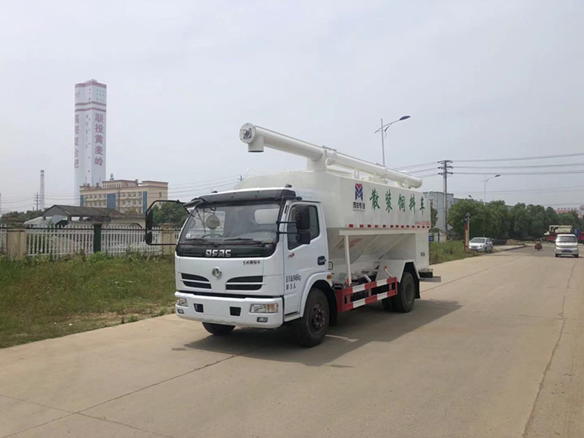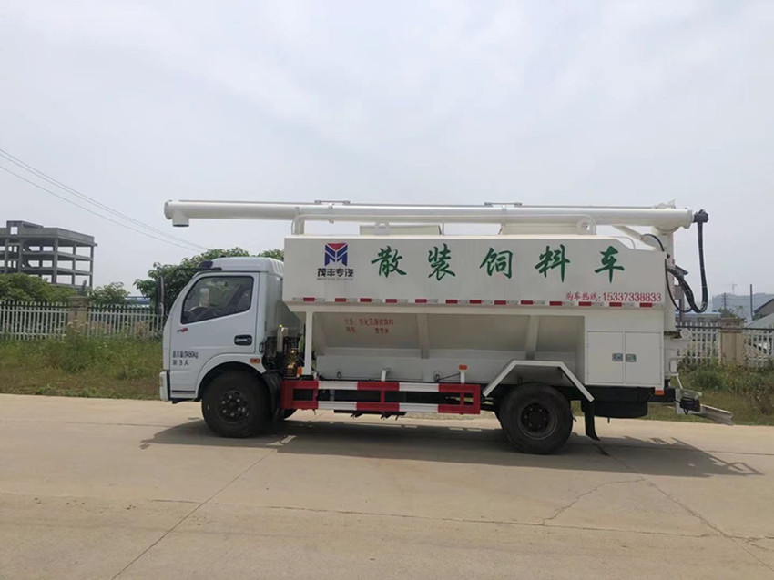 散裝飼料運輸車,散裝飼料車的飼料罐架設(shè)在卡車的底盤上,罐頂開有進料口.頂部的一根螺旋輸送卸料管(俗稱卸料絞龍)則可自由回轉(zhuǎn)和抬升,抬升的仰角可達60度。運輸時,頂部的螺旋管平臥在罐頂;卸料時則抬起,使管端的出料口與畜禽飼養(yǎng)場貯料罐頂部的進料門相接,駕駛室內(nèi)裝有操縱裝置(操縱裝置也可裝置在罐體尾部),卸料時通過車底的動力輸出軸和減速器來驅(qū)動螺旋,以完成卸料。